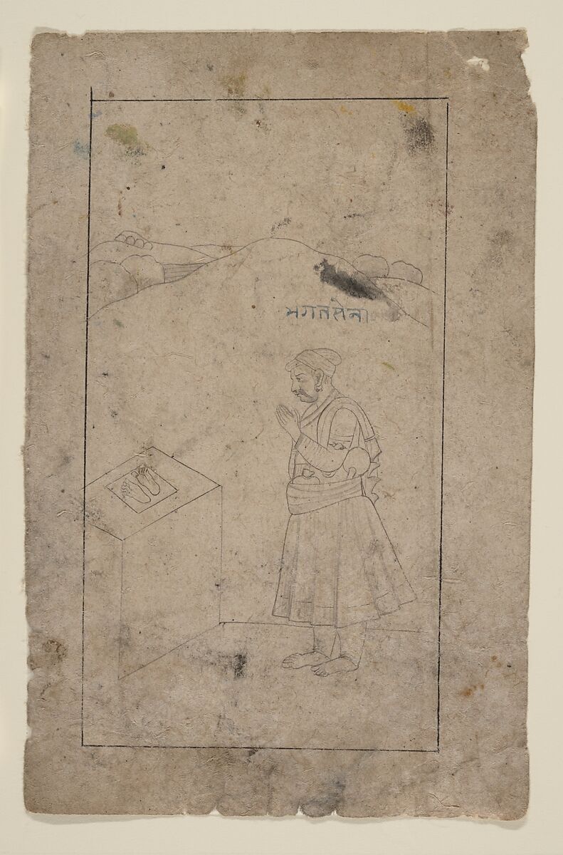 According to the inscription, this portrait is of Bhagat Sen, who stands venerating the footprints of Vishnu (Vishnupada). The flasks in his belt and the Kangra-style rural landscape suggest that he has come to this holy place on a pilgrimage.