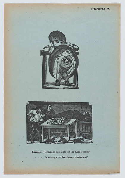 - Title: Page 7: a young girl with a face on her bottom (having two faces), a mother who gave birth to three diabolical beings, from '36 Grabados' (Mexico, 1943)