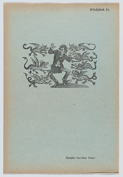 - Title: Page 11: a man being terrorised by winged demons representing the seven vices, from '36 Grabados' (Mexico, 1943)