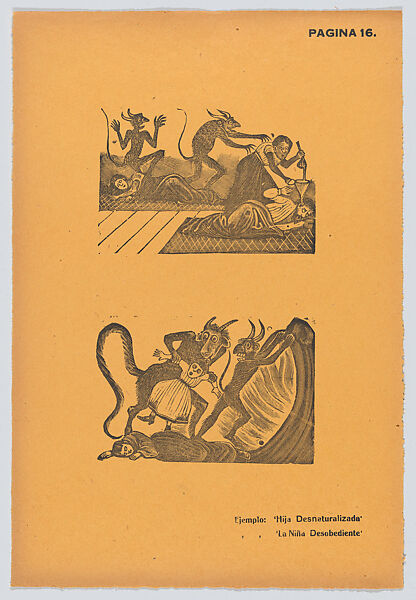 - Title: Page 16: a woman pouring liquid into a man's ear, a naughty child being snatched by devils, from '36 Grabados' (Mexico, 1943)