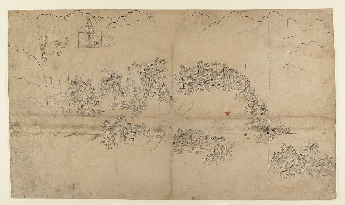 A Rajput ruler, identified by a radiating halo framing his head, oversees a hunt in which courtiers on horseback and on foot pursue packs of boars. Rolling hills mark the horizon, and at upper left is a Hindu shrine, likely a sanctuary dedicated to Shiva where the royal family worshiped. The ruler, attended by standard bearers, appears twice in the composition, enacting different stages in the hunt. The aerial view, fluid action, and confidently executed figures are characteristic of early eighteenth-century painting in the Mewar court. This drawing, probably sketched from life in the field, depicts a narrative that is fully elaborated in the painting Maharana Jagat Singh Hawks for Cranes (1996.100.3) and likely served as a study or preparatory drawing for such a finished work.