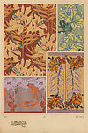 Plate, part of a collection of 30 pochoir pattern plates, originally part of a book titled "Les fleurs et leurs applications décoratives" (Flowers and their decorative applications), created by Émile-Allain Séguy and published in Paris by A. Calavas, as part of the collection "Librairie des Arts Decoratifs" (Library of Decorative Arts) in 1902. The plate features four ornamental designs inspired on the natural beauty of lilies, providing what Séguy considered a successful example of the application of scientific study of flowers in artistic creation, resulting in colorful designs likely intended for textiles or wallpapers. The first design is made up of alternating bundles of stylized lilies, colored with cream, and leaves, colored with light brown, with pastel green and blue details, over a dark reddish-brown ground. The second design is made up of a strip of bundles of semi-abstract lilies, their petals colored with light green and outlined with blue, the stigma colored with white and the anthers with light blue, and leaves, colored with dark green, on a green ground. The third design is made up of bundles of semi-abstract lilies, colored with pastel purple, and leaves, colored with shades of orange, over a grayish-purple ground. The fourth design, likely for a rug, is made up of two vertical strips of semi-abstract leaves, outlined with gray, with two pairs of stylized lilies on each end, colored with two shades of orange, and outlined with dark blue, on a yellow ground.