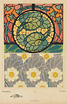 Plate, part of a collection of 30 pochoir pattern plates, originally part of a book titled "Les fleurs et leurs applications décoratives" (Flowers and their decorative applications), created by Émile-Allain Séguy and published in Paris by A. Calavas, as part of the collection "Librairie des Arts Decoratifs" (Library of Decorative Arts) in 1902. The plate features two ornamental designs inspired on the natural beauty of waterlilies, providing what Séguy considered a successful example of the application of scientific study of flowers in artistic creation, resulting in colorful designs likely intended for textiles or wallpapers. The first design, possibly for or inspired by stained glass, is made up of a black roundel with scrolling branches with waterlily leaves, outlined with black and colored with shades of green, over a black ground with small, semi-abstract waterlilies, colored with pastel yellow and outlined with red, surrounded by scrolling branches, outlined with black and colored with bluish-green, with stylized waterlilies with orange petals, over a reddish-pink ground; the lower part of the design consists of semi-abstract scrolling branches, executed with green over a dark green ground. The second design is made up of stylized waterlilies with cream petals and yellow pistils, flanked above by semi-abstract leaves, colored with gray, over a light purple ground.