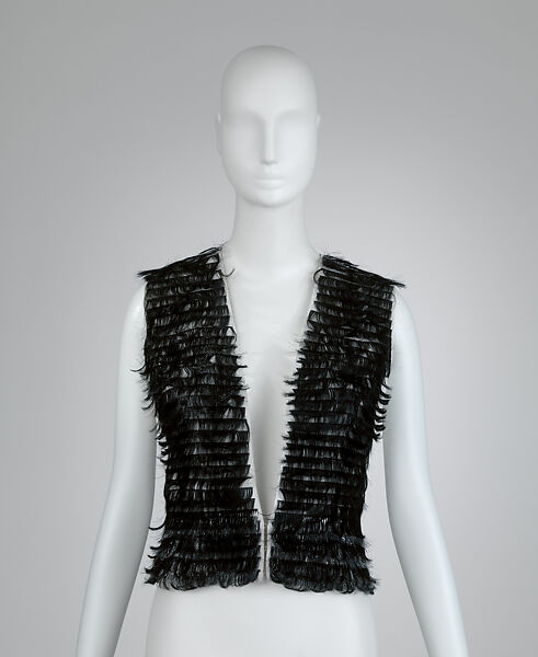 This ‘Artisanal’ handmade leather jacket with applied horizontal rows of black and silver artificial hair was made by Maison Martin Margiela for fall/winter 2009–10, the first collection designed by the collective design staff since the departure of the designer. ‘Artisanal’, the line (0) of the numbered collections of the conceptual fashion house, consisted of garments reworked by hand, usually made out of vintage garments or low-value materials. Hair and wigs are a recurring choice of material for Margiela, who previously integrated wigs from theatre costume cast-offs, flickering between glamour and the abject.