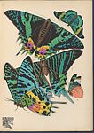 Seventh plate of album with 20 pochoir pattern plates, titled "Papillons: vingt planches en phototypie coloriées au patron donnant 81 papillons et 16 compositions décoratives" (Butterflies: twenty plates with colored phototypes with patterns with 81 butterflies and 16 decorative compositions), created by Emile-Allain Séguy and published in Paris by Tolmer Éditeur, probably in the 1920s. The plate features five naturalistic illustrations of exotic butterflies from Madagascar, Guyana, and Venezuela, executed with shades of blue, green, black, yellow, and orange. The depictions of butterflies in the illustration are remarkably detailed, revealing Séguy's unique interest in the scientific study of insects as a source of inspiration for artistic creation. This illustration was likely meant to inspire designs for textiles and wallpapers.