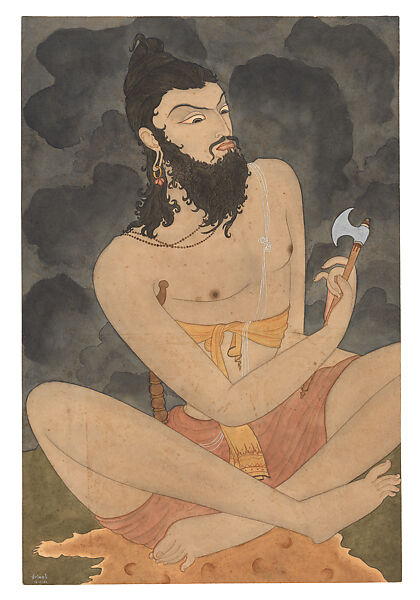 A large-scale religious work from Srimati’s early period, Parashurama depicts the sixth avatar of Vishnu. In this vengeful form Vishnu aimed to save the world from the tyranny of the aristocratic warrior class (ksatriya) and rid it of those rulers who neglect their sacred duties as kings. The mighty figure of Parashurama is seated as an ascetic on a tiger skin with his raised arm propped on a mendicant’s arm support. His brow is knotted as he looks angrily upon the world and fixes his stern gaze upon his weapon, a battle ax. Rolling storm clouds fill the background, contributing to the violent ugra mood of this painting.