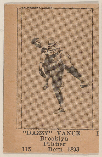"Dazzy" Vance, Brooklyn Pitcher, Baseball photos strip cards -- Brooklyn Dodgers (W504). Issued by Universal Toy & Novelty Cards. Four teams distributed -- Brooklyn Dodgers, New York Giants, New York Yankees, and Washington Senators. Numbered cards sold in sheets. 16 individual players, one large team card. Uneven borders. Back is blank. Name, team, position, and birth year on lower edge of card border. Numbered lower left.