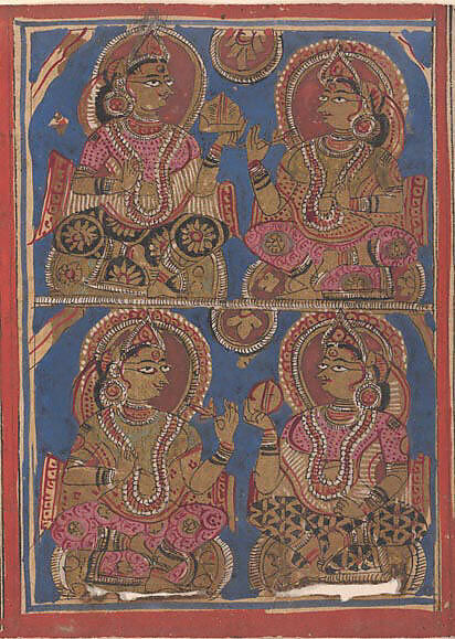 The birth of a prince who is to become a jina is celebrated on the sixth night by a vigil during which offerings are made in thanksgiving of this auspicious event. The four seated noblewomen hold an offering or gift of a mirror and flowers. The diagonal markings indicate a horizon line, and the dark blue beyond indicates that it is night.