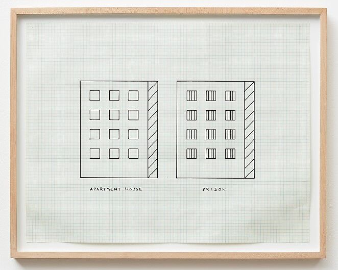In his late twenties, Halley, a central figure in the New York art scene of the 1980s as well as an accomplished critic, theorist, and writer, began to produce signature paintings that take their severe motifs from the architecture of prisons, cells, or underground conduits. Often made with Roll-A-Tex, a grainy additive used to apply texture to walls and ceilings, and in unadulterated Day-Glo colors, Halley’s paintings provide a powerful counterpoint to the work of Minimalist artists such as Donald Judd. Much of the work produced by Judd and his contemporaries seemed for Halley and other artists in New York of the 1980s to rely too heavily on the phenomenological, experiential participation of the viewer. Through Halley’s reading of poststructuralist theory by figures such as Jean Baudrillard and Michel Foucault, the artist aimed to critique what he saw as the exaggerated claims of Minimalist sculpture by producing work within a tightly organized system of discrete, geometric motifs. This drawing is one of the first in the artist’s oeuvre to begin to describe this representational system. Here, Halley seems to draw a comparison between the boxy architecture of a modernist, high-rise apartment building and the form that a prison might take. On a more theoretical level, he evokes the idea that modernist architecture, or even modernism itself, might be prison-like. Indeed, as the artist states, in his works from the 1980s, "the idealist square becomes the prison. Geometry is revealed as confinement." He continues, "The cell is a reminder of the apartment house, the hospital bed, the school desk—the isolated endpoints of industrial structure."