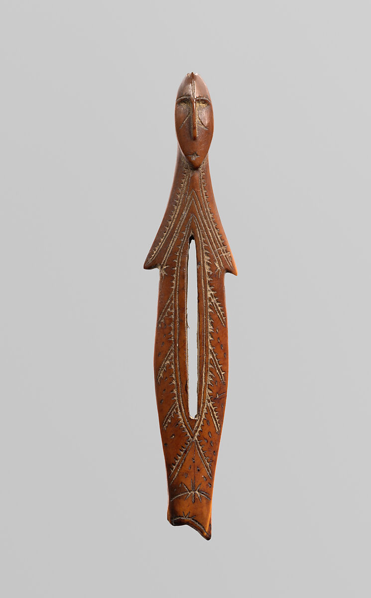 This female figure with an elongated head and torso appears part-human and part-sea mammal or fish. Although its exact purpose is specific to the owner, the narrow opening at the center may signify the boundary between the physical and spirit worlds. Carvings such as this one are among the most aesthetically refined of the Old Bering Sea sculptural works.