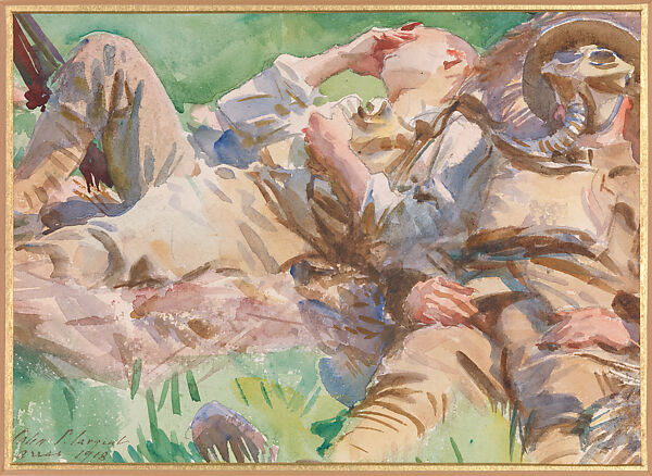During World War I, Sargent traveled to the front lines as an official war artist for the British government. He spent four months along the Western Front in the Valley of the Somme. Horrified by the use of chemical weapons, he made a number of studies of soldiers suffering the effects of gas attacks. This closely cropped view focuses attention on two debilitated men lying in the grass. One still wears his gas mask, while the other clutches his eyes, underscoring one of the grave effects of exposure to mustard gas—temporary blindness. When Sargent returned from France, he synthesized his studies into a monumental composition, “Gassed” (1919; Imperial War Museums, London), a work that heroicizes soldiers blinded by the chemical agent being led to treatment.