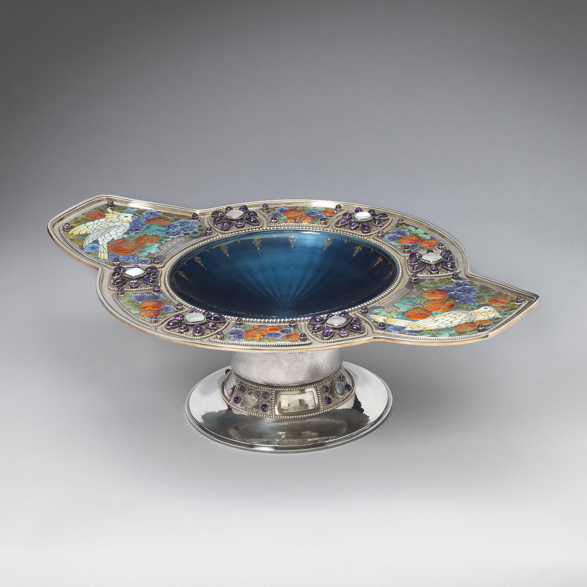 This beautifully enameled compote was produced by the firm of David Andersen, one of Norway’s foremost goldsmiths of the second half of the nineteenth century. The filigree details reflect the Romantic Nationalism of the so-called Norwegian ‘dragon style’ (Dragestilen). The enameled flowers and cockatoos are typical of local interpretations of Art Nouveau, while the blue enamel inside the bowl evokes the masterworks of Peter Carl Fabergé (1846–1920). Combining several decorative styles, this compote stands at the threshold of Norwegian (and Scandinavian) 20th century modernism.