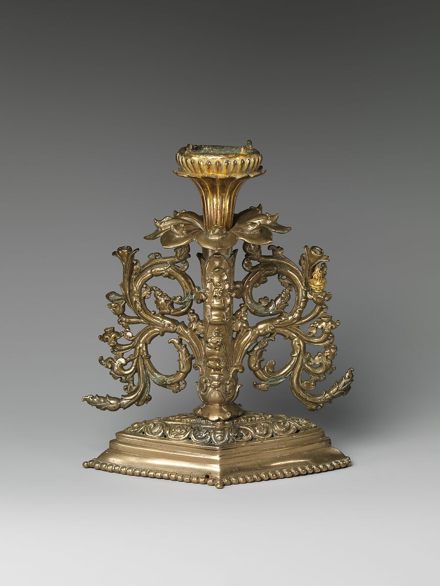 This foliate pedestal supported an icon (now missing), probably of a seated Buddhist deity in an articulated lotus-bud mandala. The finely modeled openwork design is enhanced with independently cast and gilded ornaments, two of which survive: a flame motif and a conch shell. The Burmese provenance is a reminder of the close connections that existed between eastern India and the Burmese kingdom of Pagan in the eleventh and twelfth centuries.