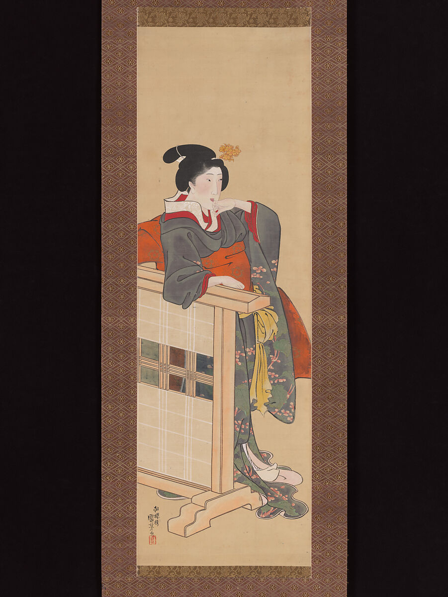 A young woman, her cheeks flushed a faint pink, rests an arm on a low, single-panel wooden screen as she gazes intently at some activity in the distance. Her dark grey outer robe bears a design of green leaves and pink blossoms; the dark orange obi around her waist is decorated with repeated floral motifs. A bright red robe and white under robe are visible at her neck, and her high chignon is tied with white cloth ribbons and features a hairpin terminating in a gilded ornament in the shape of a cluster of cherry blossoms. From her costume, hairstyle and an old inscription on the storage box, we can identify her as one of the ladies-in-waiting based permanently in the women’s quarters (ōoku) of the Shogun’s castle in Edo.