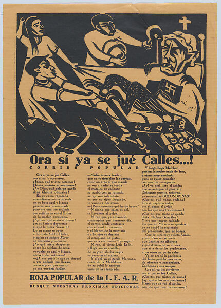 - Title: Corrido (ballad) issued by the 'Liga de Escritores y Artistas Revolucionares' (LEAR) with an image of Plutarco Elías Calles being dragged from his bed