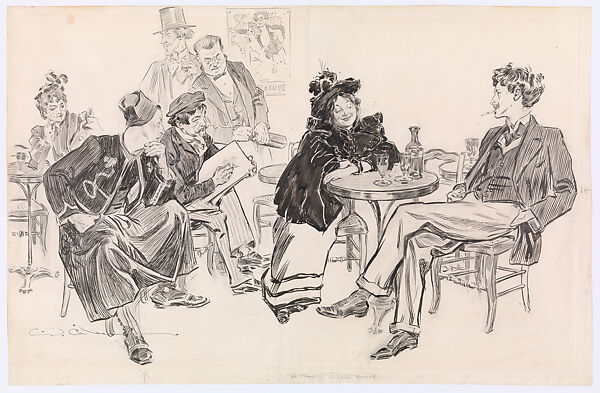 An iconic Gilded Age illustrator, Gibson described and satirized the social habits of upperclass Americans in New York and Boston, selling his first drawing to Life Magazine in 1886 and remaining attached to that publication for three decades (he became editor in 1918 and finally owner). The artist famously created the Gibson Girl, said to have been inspired by Irene Langhorne (whom he married in 1895) and her three glamorous sisters. This image portrays a range of types lounging in an outdoor café in Paris must have been made during a trip of 1893 or 1894--Gibson knew the city well, having studied at the Académie Julian. With genial humor he represents a bohemian couple, the woman's floppy velvet hat distinctly different from that of the fashionably veiled lady behind her. Her companion slouches in his chair while being sketched by a street artist whose work fascinates a Zouave (a French soldier whose distinctive uniform derives from his regiment's Algerian origins).