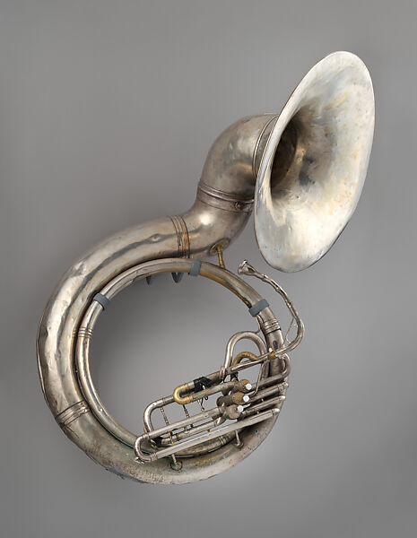 Silver-plated brass body and bell, three valves; Key of BBb, large bore; mouthpiece, crook, and neck replaced