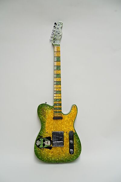 This work of art is currently on loan to the museum.This ornate Telecaster-style guitar pays tribute to “the Joker,” the masked alter ego that Steve Miller created for his breakout 1973 album of the same name. Custom built by luthier Jim Triggs, this instrument features a highly unusual yellow-green pearloid inlay over the entire body and neck and is dotted with plastic gems. It sports a decal of the mask that Miller wore on the album’s cover.
