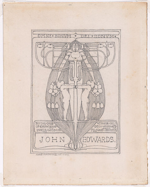 Margaret Macdonald was one of "The Four," men and women who developed an influential variant of Art Nouveau known as "The Glasgow Style." Margaret and her sister Frances met Charles Rennie Mackintosh and James Herbert MacNair at the Glasgow School of Art in the 1890s. After Margaret's 1900 marriage to Mackintosh, she woul design decorative elements central to many of his interior designs. When she drew this bookplate In 1896, Margaret was still working in partnership with Frances. The graphite design centers on the elongated form of a nude woman whose hair merges with the tendrils of a fruit-bearing tree. Printed in 1896 as a book plate for John Edwards (a patron about whom nothing is known), the admired image was also published in the "Studio" magazine in 1897 and the Austrian Secession Movement periodical "Ver Sacrum" in 1901.