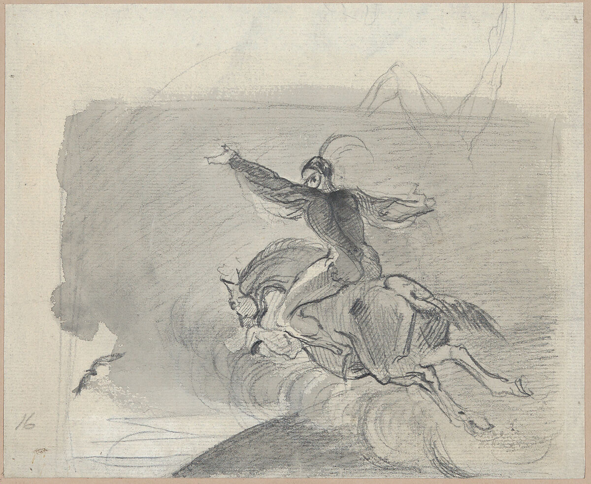 Romantic literary and fantastic subjects predominate in Von Holst’s oeuvre, derived from authors such as Virgil, Dante, Shakespeare, and Victor Hugo. He turned most often to Goethe’s Faust, and the present image of Mephistopheles echoes lines in Faust, Part I (4399-4404) where Faust and Mephistopheles are described as storming (Daherbrausend) along on black horses.