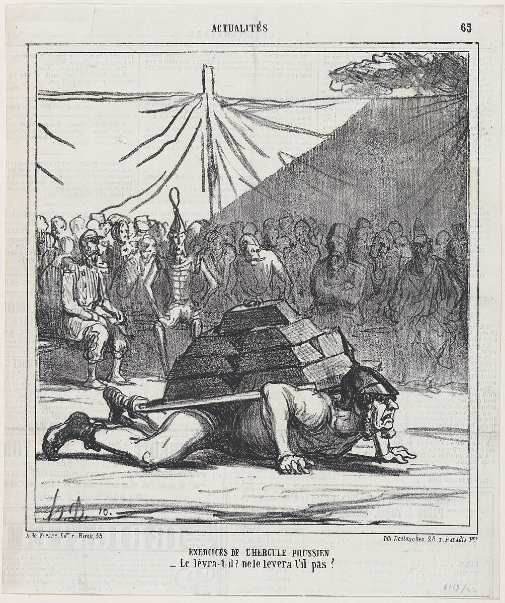 - Title: Exercises of the Prussian Hercules: Will he or won't he be able to lift it up?, from 'News of the day,' published in "Le Charivari"