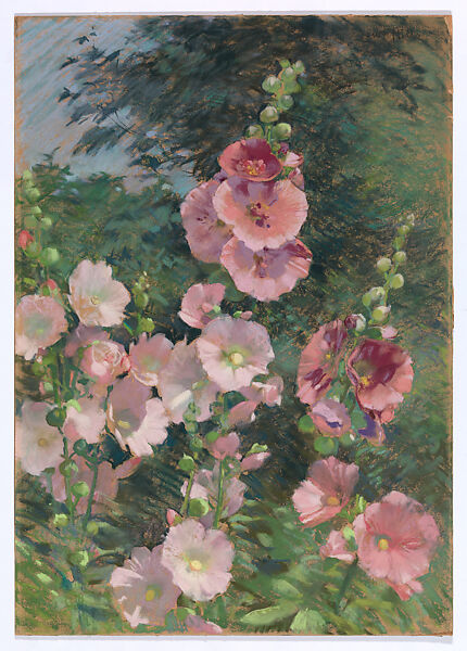 A native of Newburyport, Massachusetts, Hills began her career as an acclaimed painter of miniature portraits on ivory. After 1920, and likely due to failing eyesight, she shifted to floral still lifes, primarily produced with handmade pastel sticks she purchased in France. She was celebrated for the fresh, modernist aesthetic she brought to a subject traditionally associated with women artists. In this work, Hills employed a vertical composition to emphasize the length of the hollyhock stems against verdant foliage and blue sky. A rare example by Hills of flowers painted en plein air (outdoors) rather than an indoor tabletop setting, “Hollyhocks in the Sunshine” demonstrates her mastery of the pastel medium with its accomplished rendering of brilliant sunlight flickering across the pink blooms.