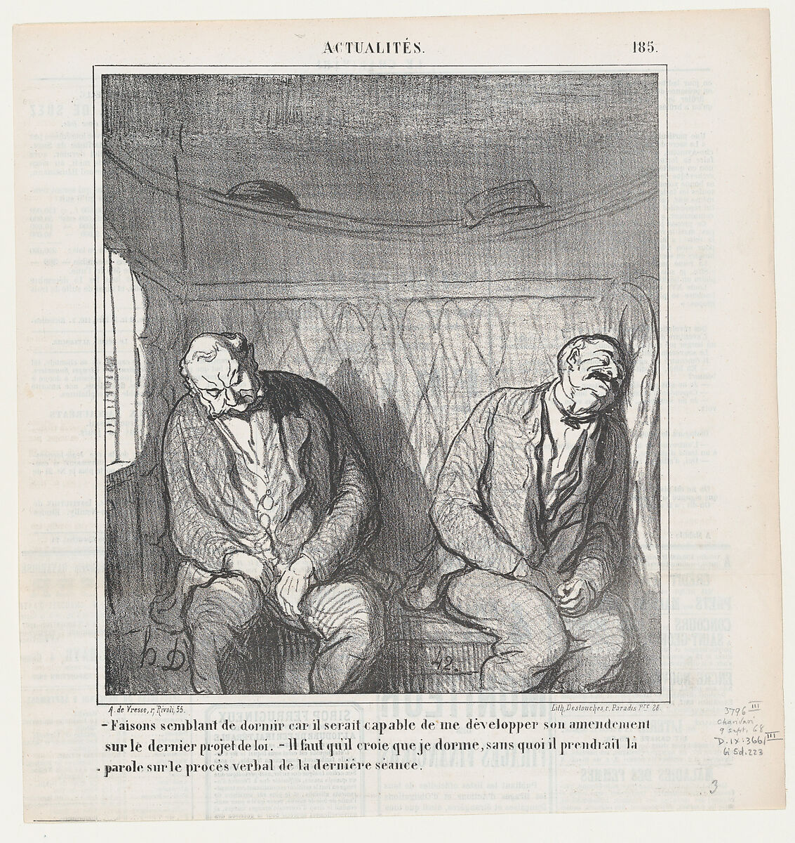 - Title: –I'll pretend to be asleep, otherwise he will never stop explaining his plans for amending his latest bill. –I'll make him believe that I am asleep or he will go on and on about the minutes of the last session, from 'News of the day,' published in Le Charivari, September 9, 1868