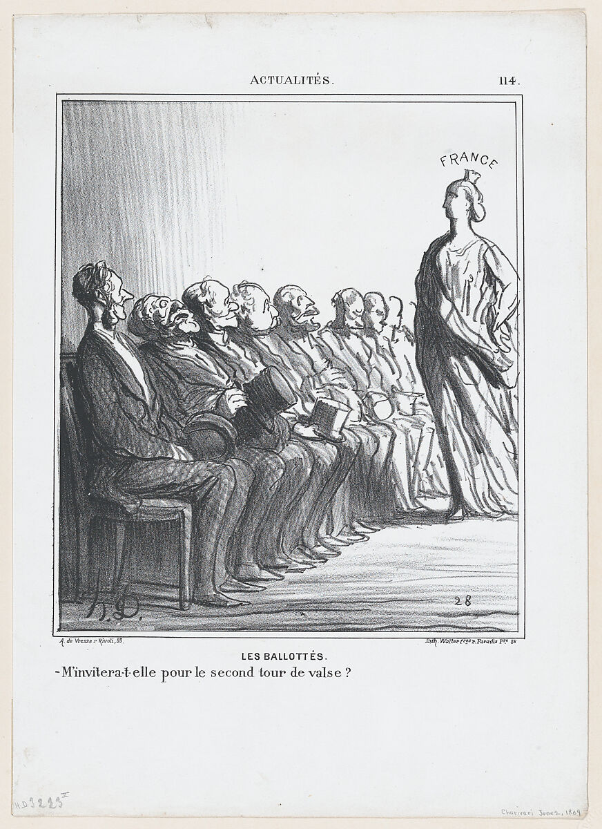- Title: Run-off elections: Will she invite me for a second waltz?, from 'News of the day,' published in "Le Charivari"