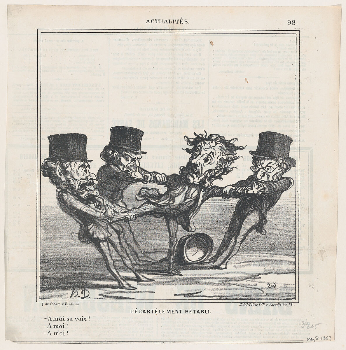 - Title: The quartering reinstated: Give me your vote! To me! No, to me!, from 'News of the day,' published in Le Charivari, May 8, 1869