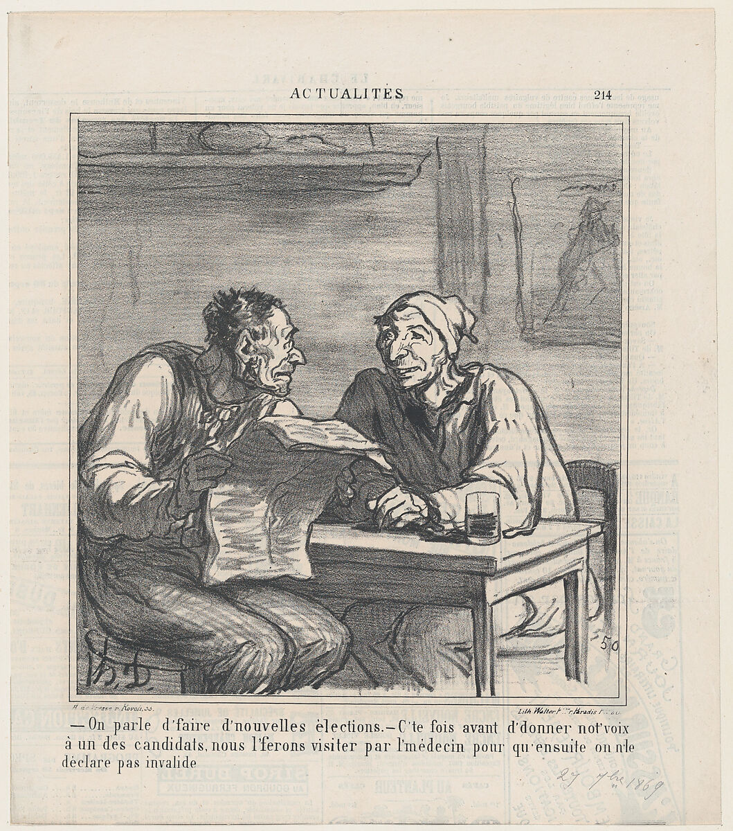 - Title: –They're talking about new elections. –Before I vote for a candidate, I want him to be examined by a doctor to make sure he is not declared invalid again, from 'News of the day,' published in Le Charivari, September 27, 1869