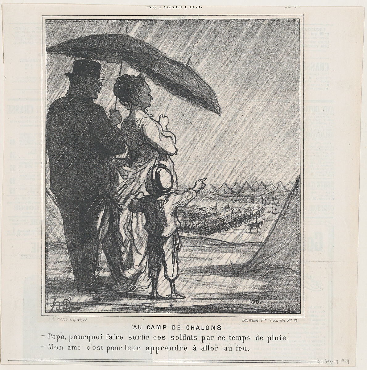 - Title: At the Chalons Camp: –Papa, why do they make the soldiers go out in the rain? –My boy, it is in order for them to learn to be under fire! from 'News of the day,' published in Le Charivari, August 19, 1869