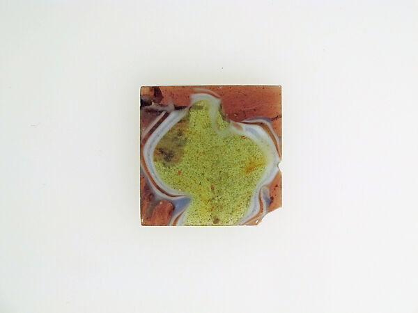 One corner missing, and another chip in one side; many pinprick bubbles; polished upper surface, with some pitting of surface bubbles; some pitting, dulling, and soil encrustation on bottom surface.