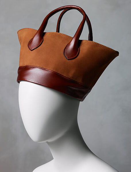 This work of art is currently on loan to the museum.For the American designer Isaac Mizrahi, fashion and fun are two deeply inextricable concepts. This ideology is reflected in the title of his autumn/winter 2009–10 collection, “Smile.” He included several colorways of this suede and leather handbag-hat on the runway, introducing some levity during a moment of anxiety following the global financial crisis of 2008. The nature of the object is contradictory: it is simultaneously functional and impractical, speaking to Mizrahi’s playfulness and ongoing interest in using design as an outlet for commentary and cultural engagement.