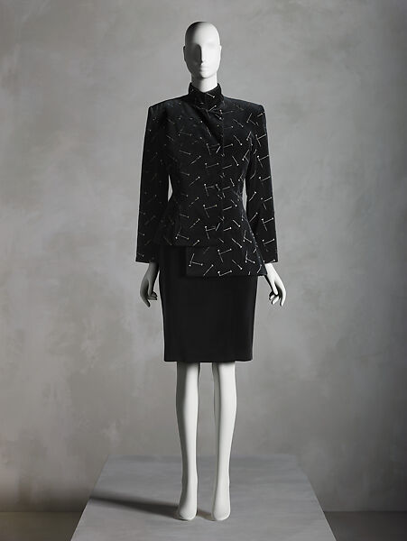 This work of art is currently on loan to the museum.Patrick Kelly often shared anecdotes from his youth about how his grandmother would cover his mended clothing with excess buttons as a decorative element to camouflage that they mismatched. This playful appreciation for improvisation was something he would go on to cultivate throughout all his work. With exuberance and joy, he regularly drew on a pastiche of autobiographical and kitsch elements that celebrated his southern American heritage, his adopted home of Paris, and his infinite number of inspirations. Kelly included a “List of Loves” as show notes the season he showed this ensemble, documenting his eclecticism through a series of items that included pretty things, fried chicken, big overalls, the couturière Madame Grès, his grandmother Ethel Rainey, Bette Davis, Martin Luther King Jr., and his target clientele of “All Women (fat, skinny and between).” This velvet jacket displays his fondness for novelty buttons with a line of flathead nails that serve as closures. In a light-hearted flourish, the ensemble was accessorized with a matching toolbox purse.