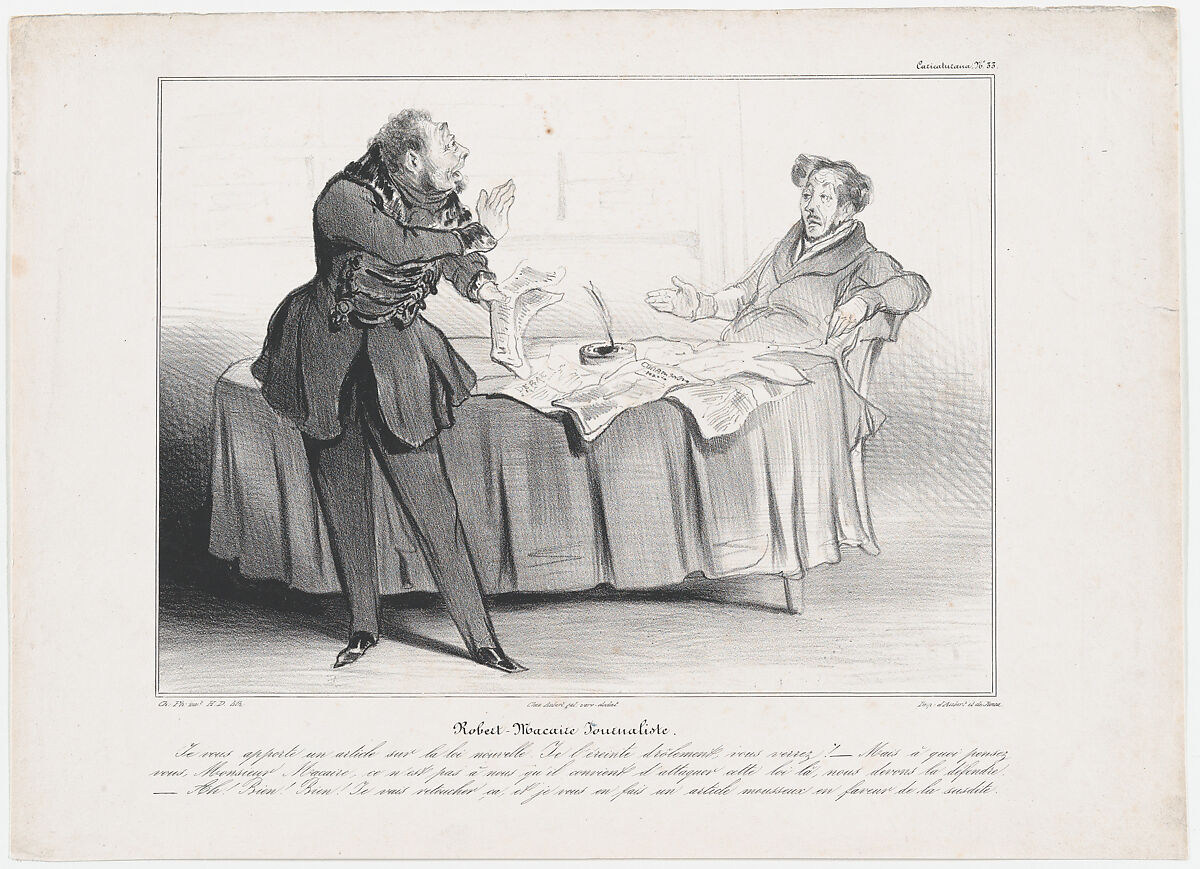 - Title:Plate 33: Robert Macaire journalist, from 'Caricaturana,' published in Les Robert Macaires