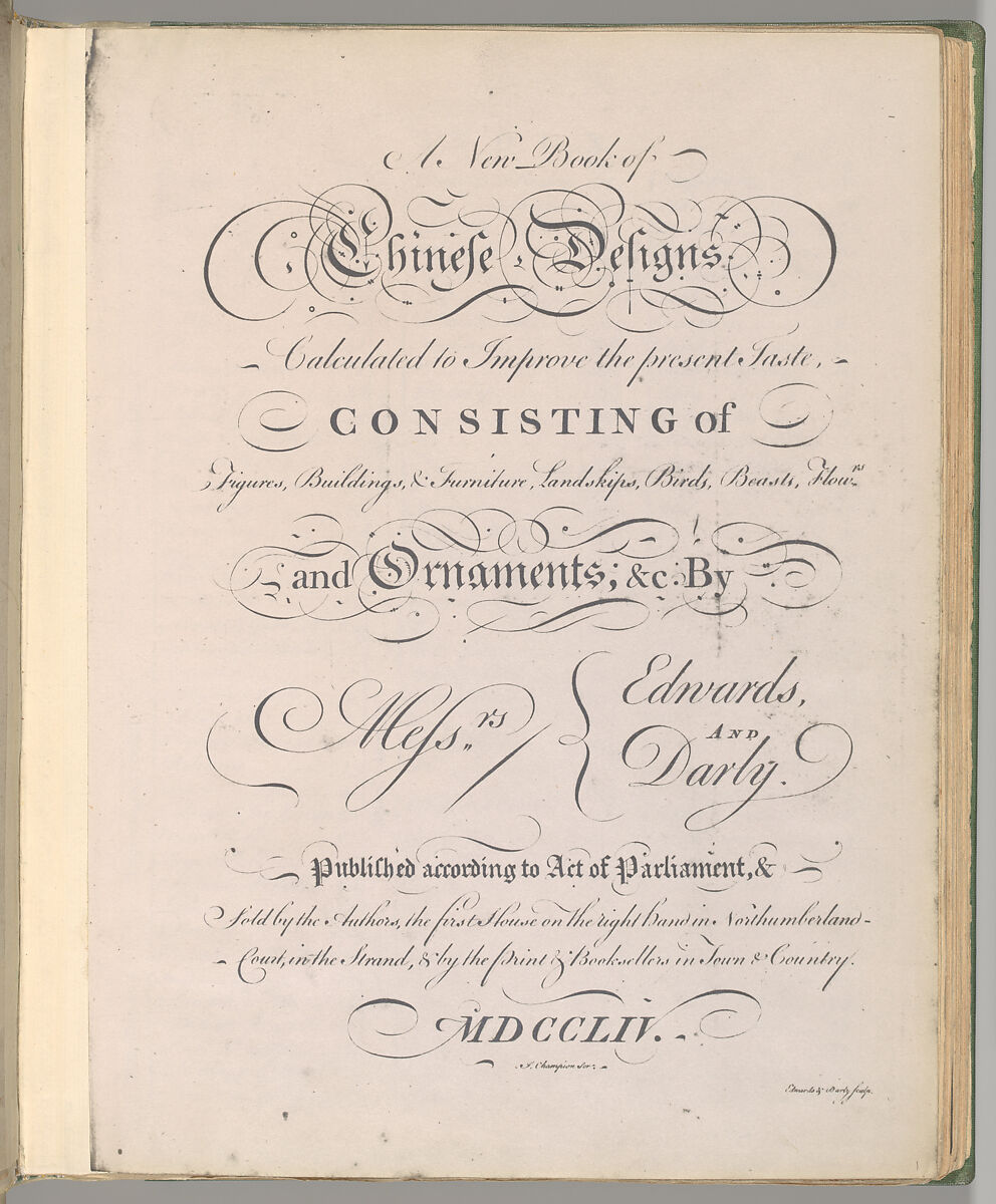 This plate, with a photostatic reproduction of the title page, consists of a title page with an inscription of the title, publishing and distribution information for the book: "A New Book of / Chinese Designs / Calculated to Improve the present Taste, / CONSISTING of / Figures, Buildings, & Furniture, Landkips, Birds, Beasts, Flowr.s / and Ornaments; &c. By / Mess.rs Edwards / AND / Darly. / Published according to Act of Parliament, & / Sold by he Authords, the first House on the right hand in Northumberland - / Court, in the Strand, & by the Print & Booksellers in Town & Country. / MDCCLIV..."