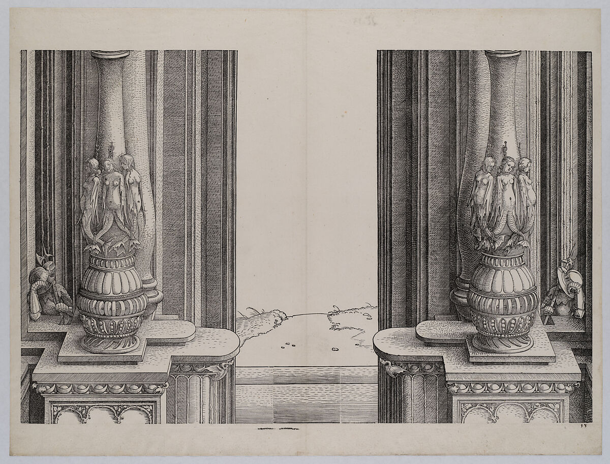 - Title: The Middle Section of the Entryway to the Central Portal, the Columns Decorated by Sirens and Sleeping Soldiers Behind, from the Arch of Honor, proof, dated 1515, printed 1517-18
