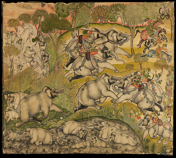 Capturing elephants for the royal herd was an essential part of Indian court life. Here the artist captured all the drama, and dangers, of such hunts in a composition read as a continuous narrative. As female members of the herd and their calves bathe in the swirling waters of a pond, the bull, sensing danger, charges through the bamboo grove to attack the pair of trained elephants with mahouts (keepers) shown at lower right. Above, the bull races to escape the trained elephants driving him into the trap, but a noose has been slipped over his head by the hunters wearing foliage camouflage; waiting in the treetops ahead is another hunter with a massive rope secured to the tree. Writing in the 1590s, Abul Fazl, the Mughal emperor Akbar’s biographer, provided a first-hand description of such hunts in his chronicle Ain-I Akbari, signaling the importance of this activity in court life