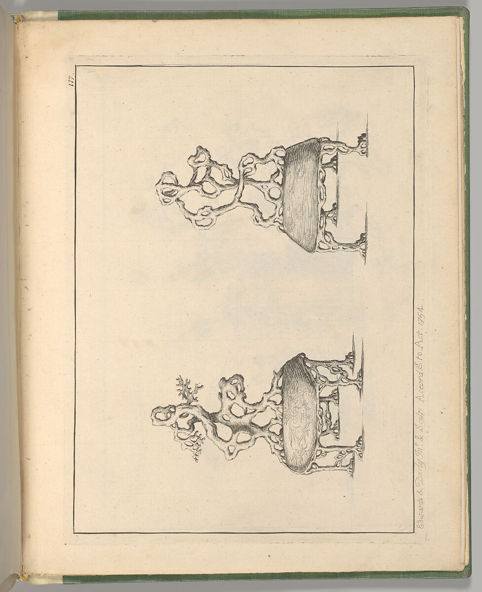 Plate 117 of 'A New Book of Chinese Designs', consisting of a title page, index, and 120 plates, etched and published in 1754 by the British caricaturist, printseller and ornamental engraver Matthew Darly, in collaboration with George Edwards. The book consists of a variety of ornamental and costume designs of Chinese inspiration, some of them copies of the original works (including the title).