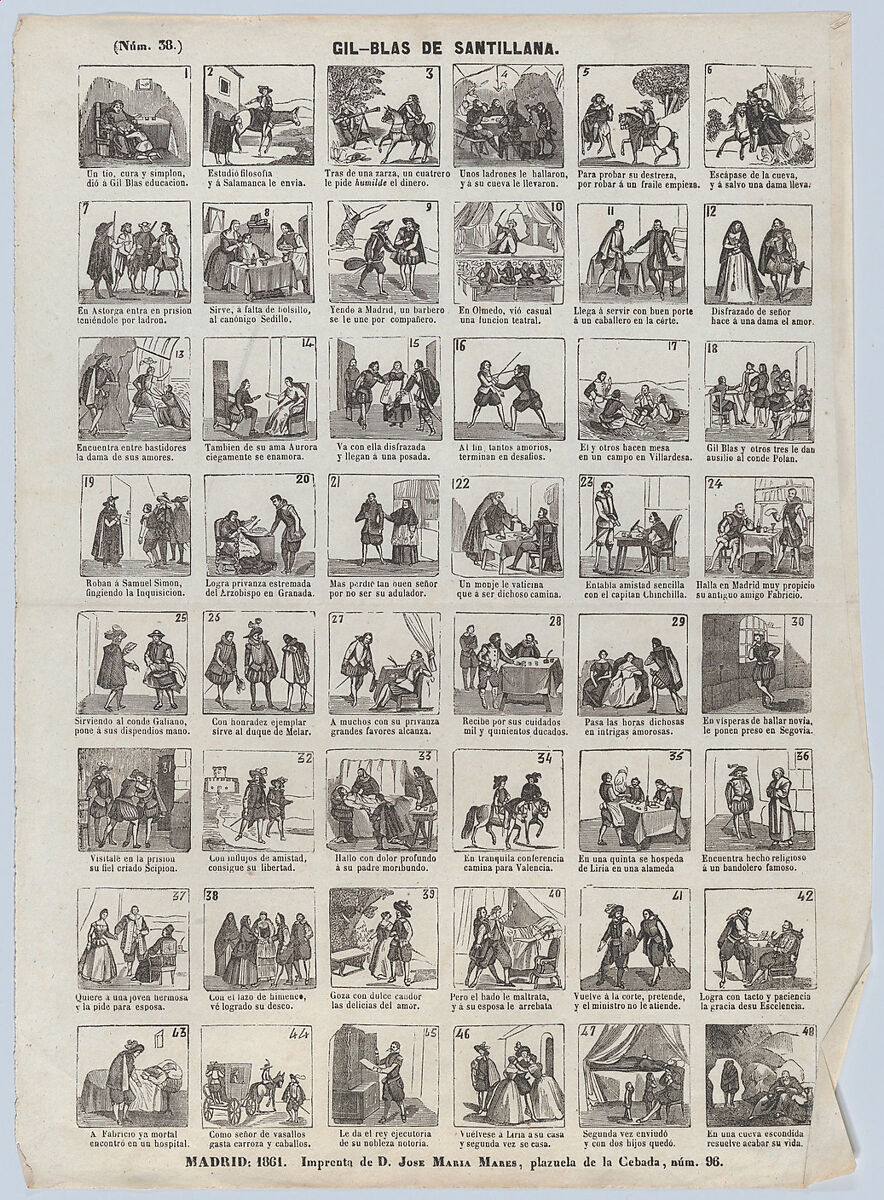 - Title: Broadside with 48 scenes showing the adventures of Gil-Blas de Santillana