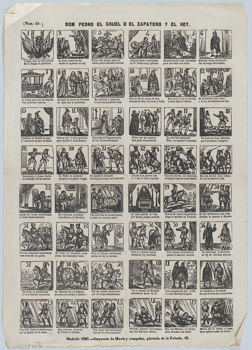 - Title: Broadside with 48 scenes depicting the story of Don Pedro the Cruel, or, the Shoemaker and the king