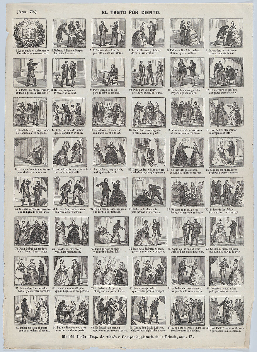 - Title: Broadside with 48 scenes relating to the comedy 'El Tanto por Ciento'