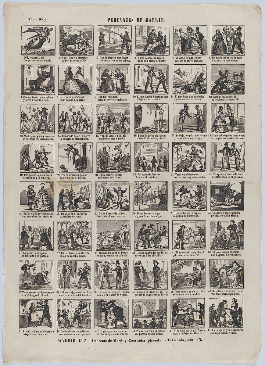 Broadside with 48 scenes depicting the mishaps in/of Madrid