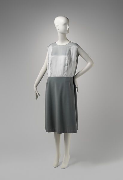 The influential “Oversized” collection by Maison Martin Margiela for fall/winter 2000–2001 featured standard garments such as this shift dress, blown up to an Italian size 78. Known for its transgressive treatment of fashionable notions regarding taste, beauty and size, the Maison introduced with this democratic collection a new size that would fit nobody, yet at the same time could be worn by everybody. The garments were fitted on an oversized mannequin and the oversized, near-grotesque outline would float over the body, the gaps were filled with silk paper for a museum-like effect. The dress replicates an underdress or lining, another beloved theme of the designer, who liked to show the interior of the garment and the artisanship hidden below the surface.
