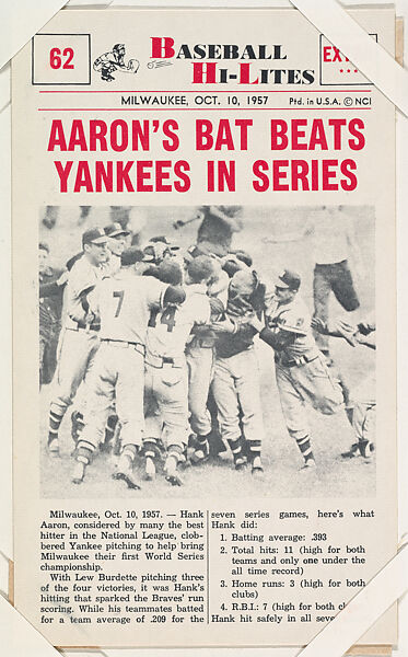 - Title: Hank Aaron #62 from Nu-Card Baseball Hi-Lites series (W460)