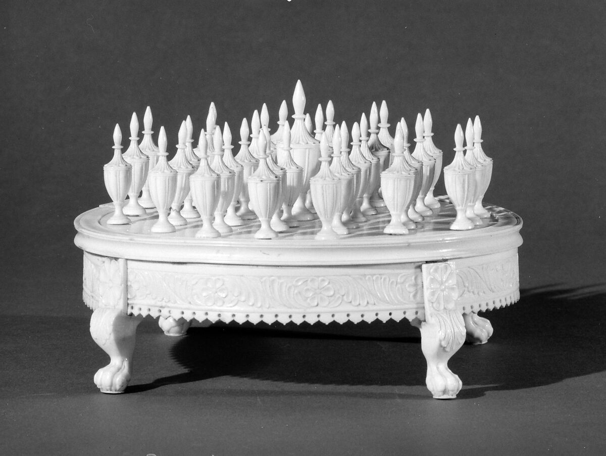 This solitaire game was made either in India or China for export to the western market. It has recently been suggested that the game is probably of Indian origin, as the border around the game board resembles one found on ivory fan mounts of Indian manufacture.