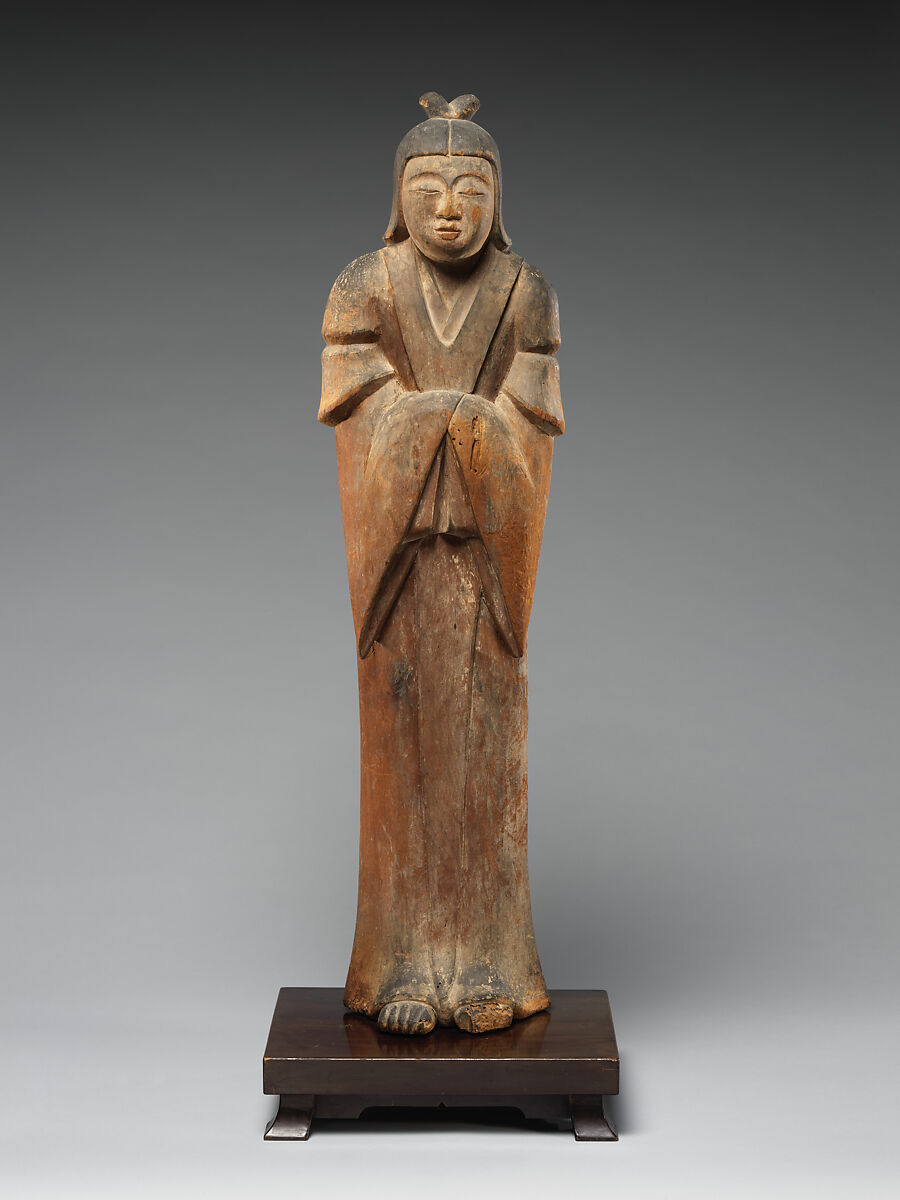 A Shinto deity (kami) appears as a lady of the Chinese court, her formal, long-sleeved garment resembling the robes worn by female Buddhist deities in images of the heavenly realm. Only with the importation of Buddhism to Japan in the sixth century did sculptors begin to represent kami in human form—often in the secular garb of the Kyoto court or in Chinese aristocratic dress, as in this example.