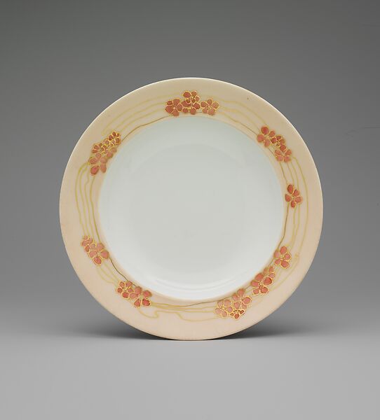 China painting, the decoration of porcelain blanks supplied by factories, was a hobby and source of income for cultured women in the late 19th-century. M. Louise McLaughlin, a leader in this pursuit, was also a founding member and President of the Pottery Club in Cincinnati, Ohio. The decoration on this soup bowl is a superb example of the level of skill achieved by many of the china painters. For other examples of McLaughlin's work, see: L.1987.11, L.1979.137.2, L.1989.14, 1981.432.2, and 1986.307.2.