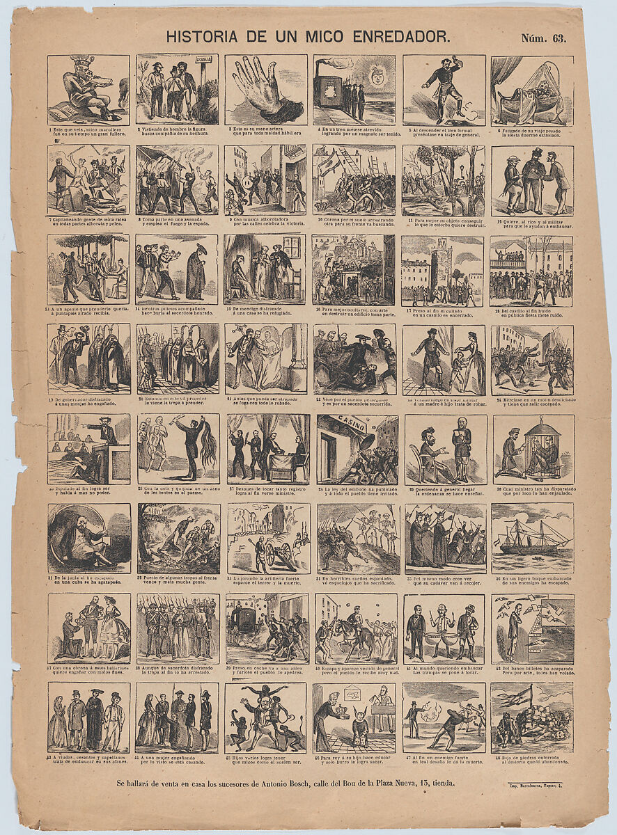 - Title: Broadside with 48 scenes relating to the story of a 'mico enredador'