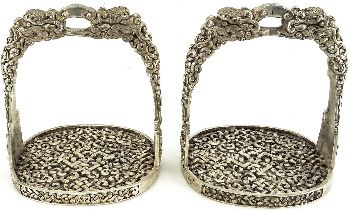 These stirrups are uniquely Mongolian and are among the most elaborate and ornate examples known of their type. The Mongols are famous cavalrymen, renowned and feared for their prowess in horsemanship for more than 1500 years. As a natural consequence of this, in traditional Mongolian culture great importance was placed on equestrian equipment, with highly decorated saddles, tack, and stirrups serving as indicators of taste, wealth, and social status. Most surviving Mongolian equestrian equipment dates from the 19th century, when Mongolia was part of China under the Qing dynasty. In many cultures, stirrups, in addition to their functionality, were platforms for the display of ornament and craftsmanship, with the best examples becoming independent works of art, uniquely expressive of the applied arts in the cultures from which they originate. The degree and complexity of the decoration of this pair of stirrups, coupled with the fact that they are entirely cast in silver, distinguishes them as one of the finest, if not the finest pair of Mongolian stirrups from the late Qing period known. In addition, they are outstanding examples of late Mongolian silversmith's work in any medium.